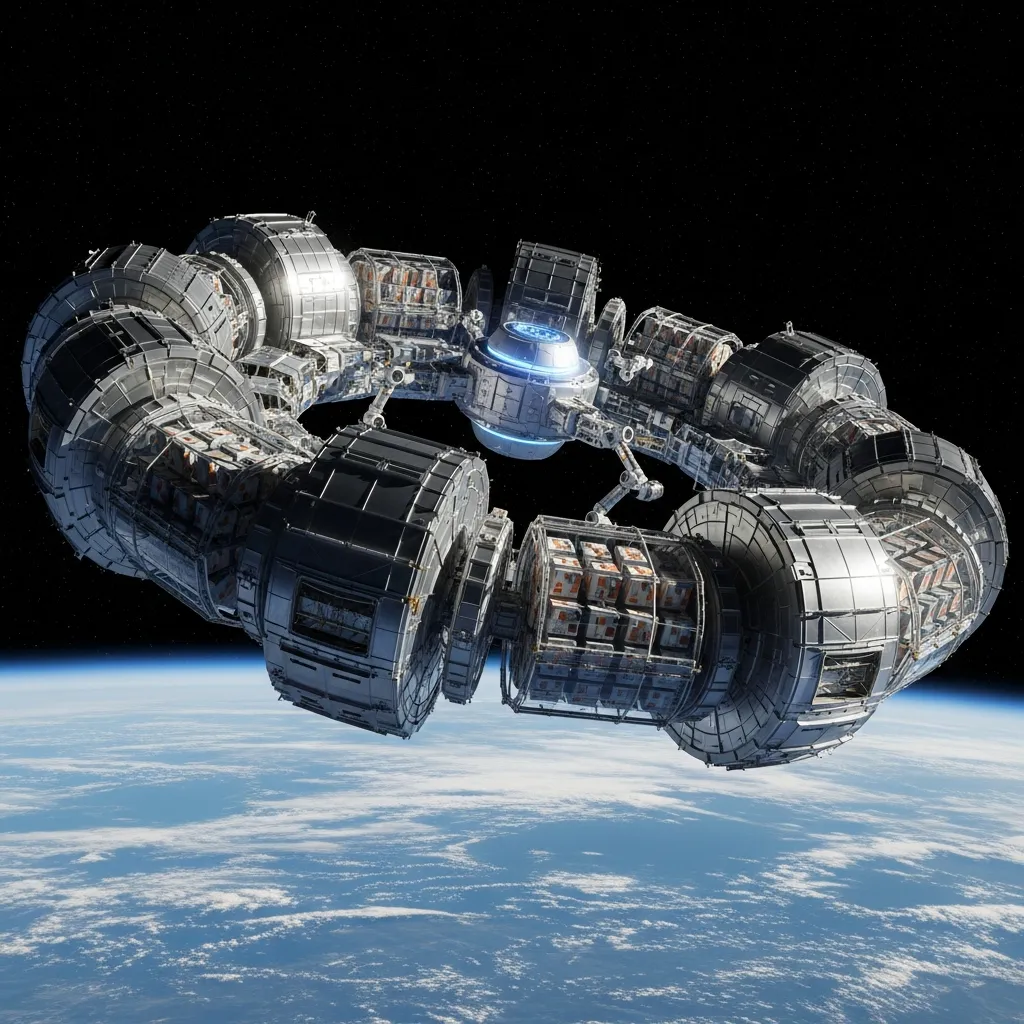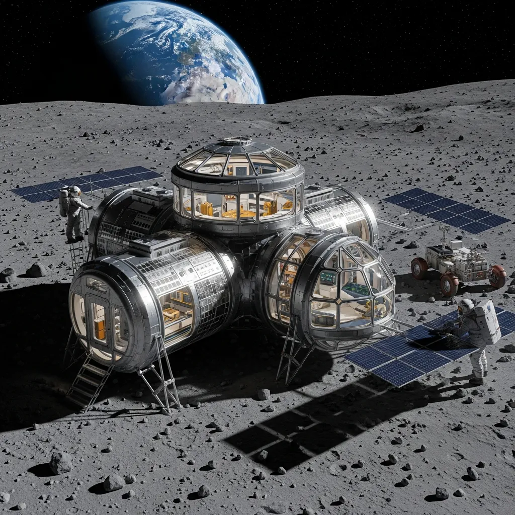 Modulært beboelsessystem designet til månens overflade, optimeret for minimal rumfart og maksimal levedygtighed.
